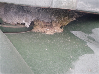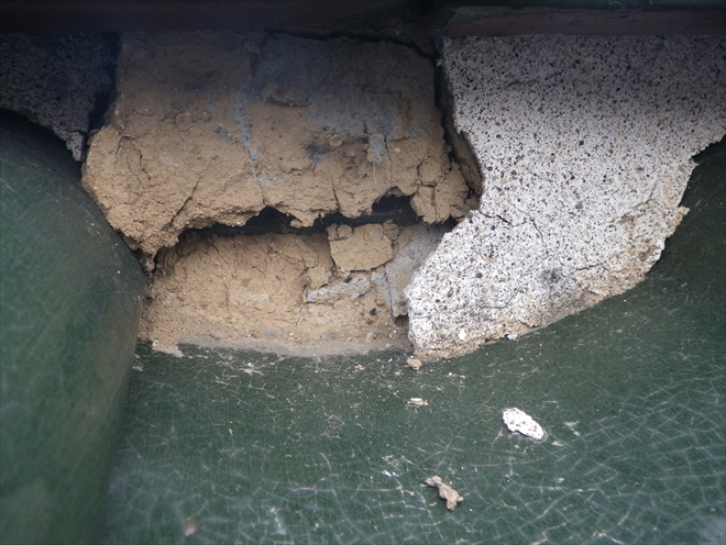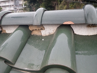 経年劣化によって漆喰もヒビが入ったり剥がれたりして土が見えてしまう事があります。屋根の上だとなかなか気づきにくいと思いますが、画像の様に土が剥き出しになっていると雨が降るたびに少しずつ土が削れて、最悪の場合棟が崩れてしまう事もあります。