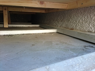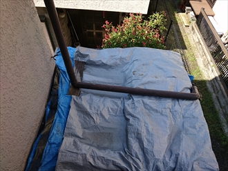 ここが雨漏りしている洗面所の上です。ブルーシートで養生をしてありましたが下の屋根には雨水が溜まってしまっていました。