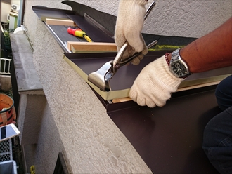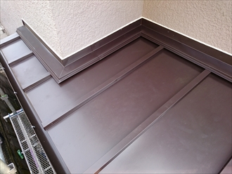瓦棒葺きの屋根が掛かっているのですが、軒先部分は箱型になっていてその部分に雨水を流す「箱樋」という造りになっていました。今回の雨漏りはこの箱樋の排水が上手くおこなわれず、雨水が溜まってしまった事で板金の繋ぎ部分から雨水が入り込んだ事が原因なので、複雑な工事をおこなわずこの屋根の上に新しい屋根を造って被せる工事をおこないました。