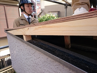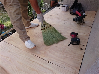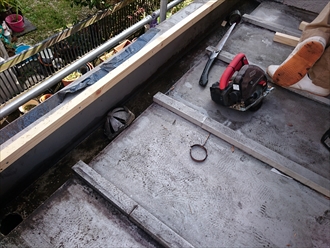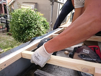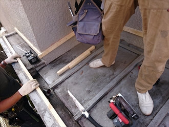 まずは屋根の下地造りからはじめます。しっかりと雨水が流れるように勾配をつけて下地を造っていきます。