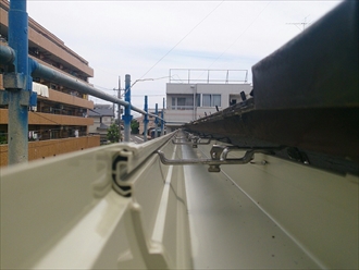 水糸を張って勾配を取ります。雨水がしっかりと流れる様に吊り込み金具を取り付けていきます。
