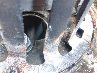 上の階の床から排水管が下りてきていますが、その回りはサビが広がっています。この状態ですと、最近劣化している訳では無く、結構前から雨水が流れていたのが分かります。横浜市西区でバルコニーの排水管からの水漏れを確認したところ、原因は上で想定した通り排水管と防水の取り合い部分で間違いありませんので、しっかりと防水処理してこれ以上被害が広がるのを防ぎましょう。