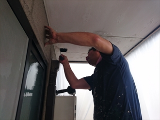 横浜市西区で先日雨漏りの調査をおこなった建物です。バルコニーの天井部分から雨水が垂れていて軒天がボロボロになっています。原因は上の階の排水口と防水の取り合い部分に開いている隙間ですので、修理をおこなう必要があります。排水管の回りを伝わって下の階に漏れる雨水を止める為に、まずは下の階のバルコニーの天井を剥がしてどの様になっているのかを調べていきます。