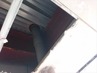 軒天を剥がして中の状況を見てみます。軒天はケイカル板が貼ってありましたが、雨漏りによってボロボロになっていて簡単に剥がす事が出来ました。上の階の排水口回りの防水処理をする前に、漏れている個所の確認です。