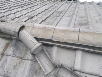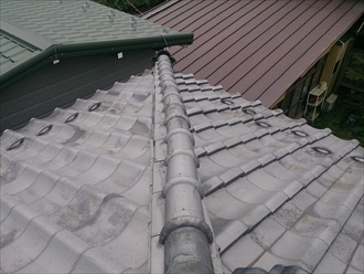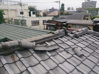 のし瓦があるので直ぐに雨漏りなどにはなりませんが、銅線などで縛っていないので、のし瓦が左右に広がって棟が崩れそうです。下り棟も曲がっているのが分かりますか?ズレは直せる範囲で直しましたが早急に棟の取り直し工事を行わないといけません。崩れて雨漏りする前に直しましょう。