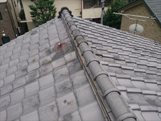 屋根の状態です。棟の冠瓦が外れて屋根の上に転げ落ちています。縛っているはずの銅線が見当たらないので固定する事が出来ません。のし瓦の上には泥の跡が有りますが、綺麗に流れてしまっているので、随分前からこの状態だった事が分かります。