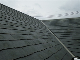 横浜市青葉区で屋根の調査をおこないました。そろそろ塗装を考えているというお客様で、屋根の状態を確かめました。雨が上がって暫く経ったタイミングで屋根に上ったのですが、スレート葺きの屋根は乾いた部分と濡れた部分があります。本来であれば、雨が降れば屋根材の表面を雨水が流れていくのですが、築年数が経過していくとスレートの表面が劣化してしまい撥水性が無くなってしまいます。撥水性が落ちてしまうと雨が降るたびにスレートが雨水を吸うので、濡れて乾いてを繰り返す事でスレート自体の劣化が進んでしまい反りや割れが出てしまいます。まだ築年数が経過していないので下地の状態は悪くはありませんので、塗装工事で表面の撥水性を戻し、これ以上の劣化を抑える事が可能です。
