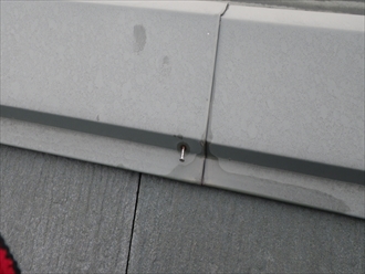 それ程大きくありませんが、よく見るとスレートにはヒビ割れが結構入っています。まだ小さいのですが、ここからどんどんヒビ割れが大きくなって最悪の場合割れて落ちてしまう事もあります。棟板金の釘が若干浮いているところもありますが、下地の貫板は大丈夫なので、釘の代わりにビスで補強すれば問題ありません。横浜市青葉区のスレート屋根は表面が劣化して雨水を弾かなくなっていますが、まだ状態は良い方ですので塗装工事で表面の塗膜を保護して劣化が進むのを抑えていきましょう。