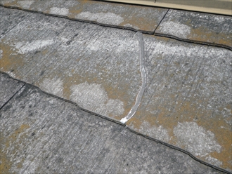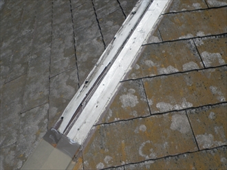 スレート葺きの屋根で所々コーキングでの補修跡があります。塗膜が殆ど無くなっていて、以前に塗装工事を行った形跡はありません。元々は黒だと思うのですが、剥がれてしまい屋根全体が白っぽくなっています。