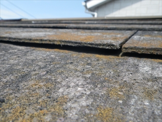 屋根全体がこの様なスレートの状態です。反りが出ていて割れている箇所もあります。塗膜が飛んでしまいスレートの劣化が進むと反りが出てきます。重なって隠れている部分で釘で固定されているために、先が反り上がってきてしまいます。こうなると、強風などでばたついて割れてしまったり、雨水が吹き込んでしまいます。スレートは元々屋根材の下の防水紙でもっている部分も有りますので、もし防水紙が劣化していたら直ぐに雨漏りの原因になります。
