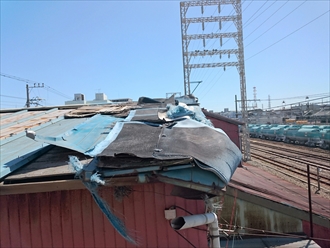 すぐ横を線路が通っているために、もし捲れたトタンが強風に煽られてしまい、線路のうえに落ちてしまったり電線を切ってしまったら大変な事になってしまいます。トタン屋根は定期的に塗装工事をおこなわないと、こちらの建物の様にどんどんサビが進んでボロボロになってしまいます。また、線路脇などは電車が走る時の線路と車輪の摩擦によって鉄粉が舞います。その鉄粉も板金にとっては非常に厄介なもので、表面に付着した小さな鉄粉がサビていく事で、あっという間に板金まで侵食していきますので、材料選びの時に錆び難さはとても重要な要素になります。
