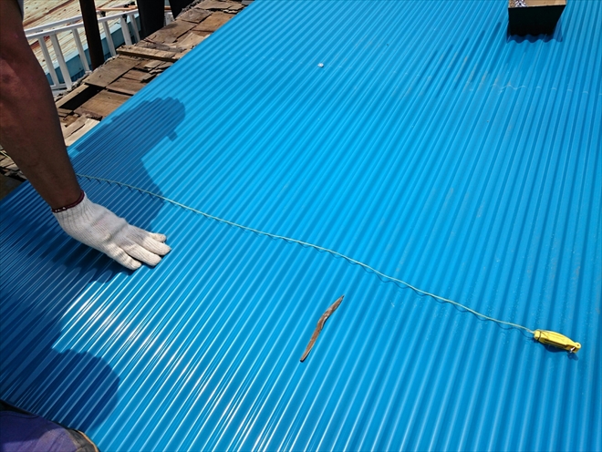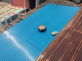 横浜市鶴見区で屋根の葺き替え工事です。昨年サビてめくれてしまったトタンの波板屋根を部分的に直しましたのですが、同じ金属屋根でも耐久性が非常に高いガルバリウム鋼板製の波板に葺き替えました。昔から使われていたトタンも現在主流のガルバリウム鋼板も同じ合金メッキ鋼板ですが、二つの鋼板の大きな違いはガルバリウム鋼板の方が錆びにくく耐久性が高い事で、いま『板金』といえば間違いなくガルバリウム鋼板の事をいいます。長い年月の風雨によってメッキがどんどん劣化していってサビが広がっていき、ボロボロになって穴があいたりすると新しく葺き替える必要が出てきます。