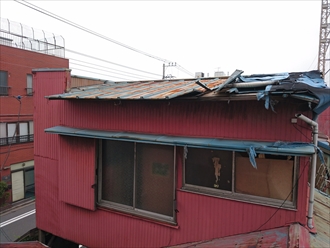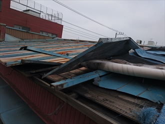 昨年の工事は、一番劣化が酷かったところを部分的に葺き替え工事をおこなったのですが、左の画像のところもトタンの瓦棒屋根がめくれていてシートなどで養生してありました。右の画像は今回撮影したもので、一年前には捲れていなかった部分まで被害が広がってきていて今にも飛びそうでした。
