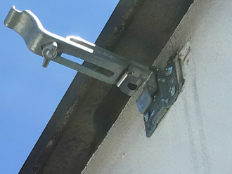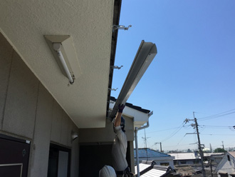 こちらは別のお住まいで行った雨樋交換の様子を参考にご紹介いたします。まずは古い雨樋を取り付け金具と一緒に撤去します。その後清掃を行い、水糸を引いて集水器の方に下るように傾斜を付けます。水糸に沿って金具を取り付け、その後雨樋を取り付けます(右写真)。