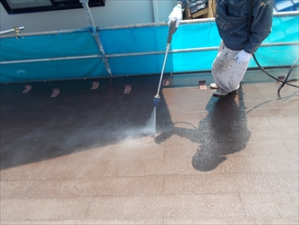 屋根と外壁を高圧洗浄機で水洗いします。