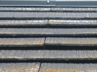 拡大するとスレートが反っているのが分かります。表面が劣化しているため下地が剥き出しになっていました。殆ど全てのスレートが反り返ってしまっていました。ここまでスレートが劣化していますと、塗装をする事は出来ません。正確に言うと、出来ないのでは無く、塗装しても耐久性が確保がされないという事です。