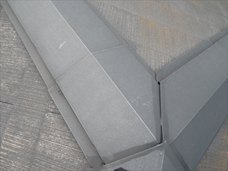 棟板金のジョイント部分が口を開けていて、コーキングなどで隙間を埋めないと雨が侵入してしまいます。