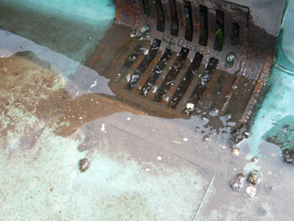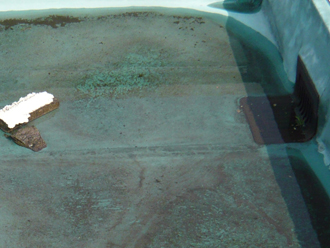 写真を見ていただくとわかるように屋上の排水ドレン廻りにゴミが溜まっている状態のため、排水口が詰まってしまい、水が流れにくく屋上に水がたまってしまっています。水がスムーズに排水されないためやっと乾いた屋上表面には黒ずんだカビやコケが発生してしまっています。