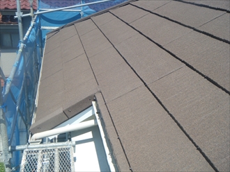 写真でも塗膜が劣化しているのがわかると思います。元々のスレートの色は黒なんですが、塗装をして茶系にしています。