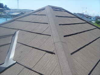 使用した材料は、エコグラーニと言う屋根材です。ジンカリウム鋼板に細かな石を吹きつけてある材料で、メーカー保証が30年付きます。非常に軽い材料で、カバー工事でも葺き替え工事でも対応できる屋根材です。6寸勾配までは雪止めも必要ないので、オススメです。