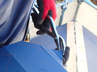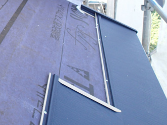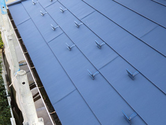 屋根カバー工法は既存の屋根の上に防水シートを敷き、その上に新しい屋根材を葺いていくため、屋根が二重になることから断熱性などはアップしますが、屋根自体が重くなるといったデメリットがあります。よって、軽量な金属屋根材の方が屋根カバー工法に向いています。施主様と何度もご相談を重ね、決定した屋根材はガルバ断熱ルーフ「ガルテクト」です。重量は1㎡あたり5kg、スレート屋根と比べると約1/4の重量、瓦屋根と比べると約1/10です(※メーカー:アイジー工業株式会社HPより)。