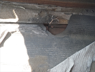 下から見ていてなんとなく剥がれているな、と思っていたそうですが、ベニアが剥がれてしまったので張替工事のご依頼でした。建物を調査すると原因が分かりました。