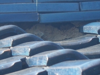 棟瓦の漆喰が剥がれています。下地の泥が剥き出しなので、放っておけば棟が崩れてしまう可能性が高いです。また、瓦がちょっとずつズレて来ています。このズレが大きくなってくるとあっという間に崩れます。
