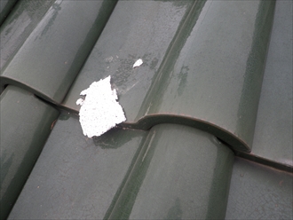屋根の上に漆喰が転がっています。棟の漆喰が剥がれて泥が剥き出しになっていて、雨によって泥が流れ出ていました。