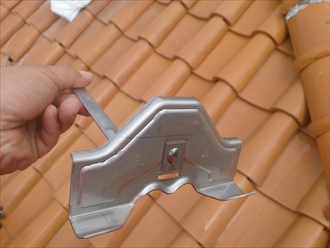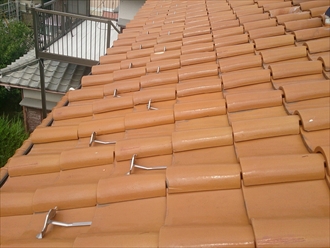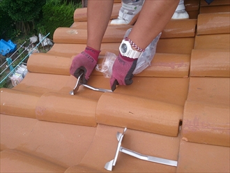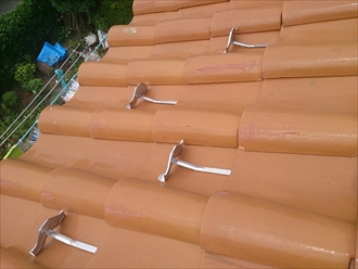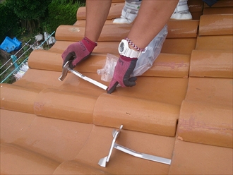 取り付け方法は非常に簡単です。まず取り付け位置の上の瓦を持ち上げて雪止めを差し込みます。先が90度曲がっているので、瓦に引っ掛けて持ち上げた瓦を戻して取り付け完了です。簡単ですよね。これを上下ジグザグに取り付けしていきます。