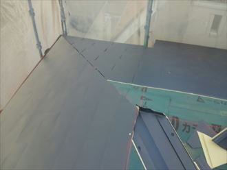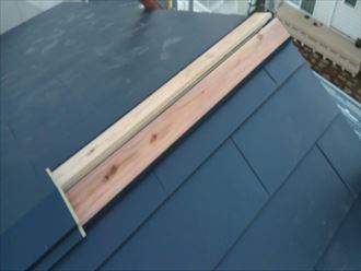 谷板金の納まりの様子です。一番頂上に近い部分が下側に折られていて水が浸入しない様になっています。軒先から屋根材の本体ヒランビーを葺きあげてきたら最後は棟の部分をおおってあげる為の板金、棟板金といったら棟包みと言ったりいます、を付けて完成となりますが、つけるためには下地が無くてはいけません。その下地となるのが、木材の貫板です。いまは腐食に強い樹脂製の貫もありますので、予算や用途に合わせてご提案をさせて頂いております。