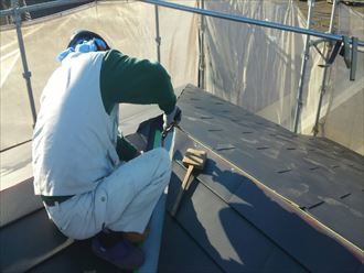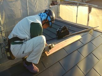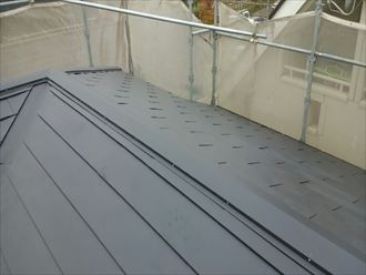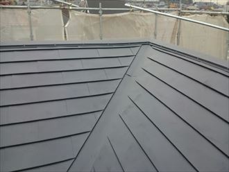 棟の板金を付け終ったら、足跡などで汚れてしまった部分の掃除を行って完成になります。今までが瓦屋根だっただけにとてもスッキリとした屋根になりました。屋根の重量減にも大きく貢献しています。何より瓦が外れて落下する、と言ったことが全く起きることがなくなった安心感はお客様にしかわからない事なのかもしれません。