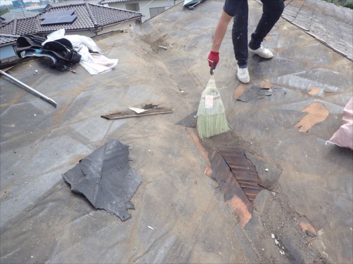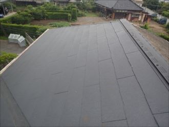 いざ工事が始まり、屋根コロニアル瓦を撤去してみた所、下地に雨水が侵入した跡がはっきりわかりました。下地にも浸透し劣化が始まりつつあるところでした。まだ下地ベニヤが腐ってはいなくギリギリそのままの状態で使用する事が出来ました。このまま放置していたら、木質付部分は劣化が進行し朽ちて無くなっていたでしょう。下地が無くなってしまっていたら、下地ベニヤから交換が必要になり工事金額が上がってしまうところでした。