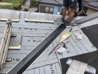 谷板金は交換することに伴ない周りのコロニアル瓦も交換が必要になってしまいます。コロニアル瓦も重なり合って釘で止めてあるので、少なくても谷板金に接している、一面ずつ全て新規に交換が必要になり、板金一枚のために大きな工事と発展してしまいます。アスファルトルーフィングも谷板金付近は二重に現在では設置しています。