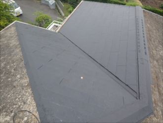 棟の部分には大きな換気棟が設置して在りました。小屋裏の湿度や温度を自然換気にて調整する物となっています。換気がないと熱気や湿気を逃がすことが出来ず小屋裏の状態を良好のまま維持できなくなります。現在では小型化されているので通常の棟板金とほぼ同じ大きさになっており一見換気棟とは解らないくらいです。屋根工事では一番最後の工程となり、棟板金を取り付け今回の雨漏れ補修工事は完成になります。