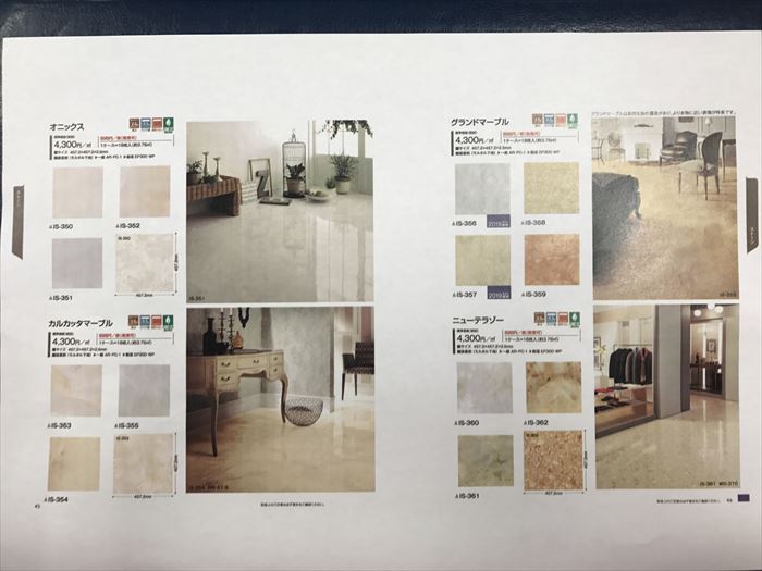 カタログにより選び商品を選ぶのですが、サンプルもご用意できます。質感や色合いなどがカタログからですとイメージが付きにくいと思います。床はお部屋の中でも大きなスペースなので、変えると大きくイメージが変わります。一度変えると長い間取り替えないと思いますので、慎重な選定が必要です。フロアータイルはタイルカーペット同様に一枚一枚が独立しており傷ついてしまったら部分的に張替えが可能です。