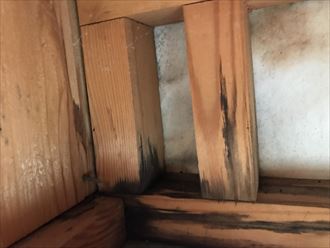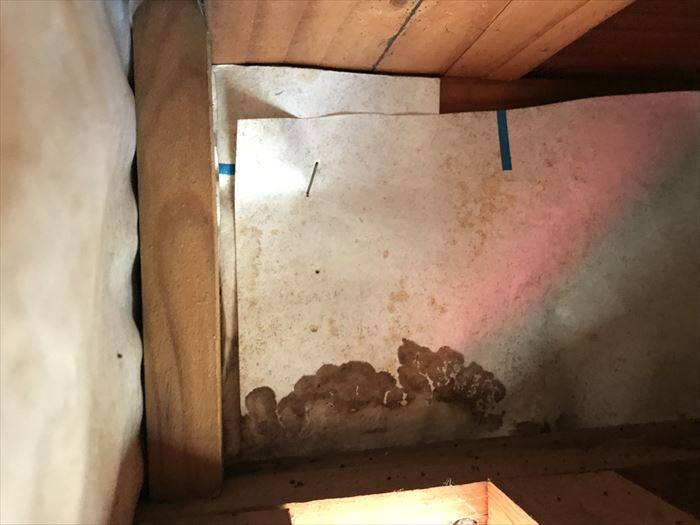 このような作り方は多く、よく建売住宅に見られます。初めはシーリングにより雨漏れは無いのですが、シーリングの経年劣化により壁内部へと浸入してしまいます。入ったものは外に出せる水切りがあり、防水紙で雨水が防げればよいのですが、今回の様に下端をきっちり塞いである場合は雨水の逃げ場がなく天井裏に浸入してしまいます。今回の調査で原因を追及することは出来ました。以後の工事の提案としては、下がり壁への水切りの設置か簡易的シーリングによる雨漏れ止めの何れかになります。いずれどちらの工事でも雨漏れは解消されますが、今後先の事を考えるのであれば、水切りの設置をお勧めいたします。