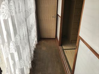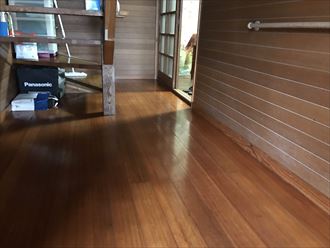 お客様の床は。突板フロアでした。ワックスなどのメンテナンスをしないと、シミや剥がれなどが表面に出てます。合板フローリングなので、ボンドの経年劣化により、強度が落ちてたわみが生じて来てしまいました。改善策としましては、カバー工法で既存の床の上に新たにフローリングを貼り付ける工事がお勧めです。施工上、既存床の後に施工した和室の敷居や建具が多いため、解体できない箇所が多く、大がかりな工事になる可能性もあります。。床の経年劣化などで、お困りの方は一度ご相談いただければ、よい解決方法をご提案いたします。