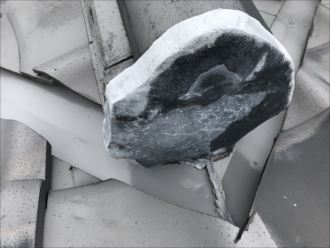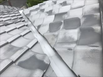 よく雨漏れ原因となる谷板金と棟端部になります。谷板金は左右からの雨水が集中して集まる部分ですので劣化しやすく、一度穴が開いてしまったら、補修ではなく取り換えが必要になる場所です。目視により劣化状態を見ることが出来ますので、悪くなる前に塗装や交換などのメンテナンスが必要です。今回は漆喰などの状態も良く、屋根全体の状態は比較的によく早急なメンテナンス工事は必要がありませんでした。全ての屋根の状態などもチェックしたことをお伝えし、お客様のお悩みも解消していただきました。