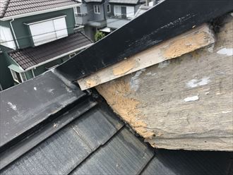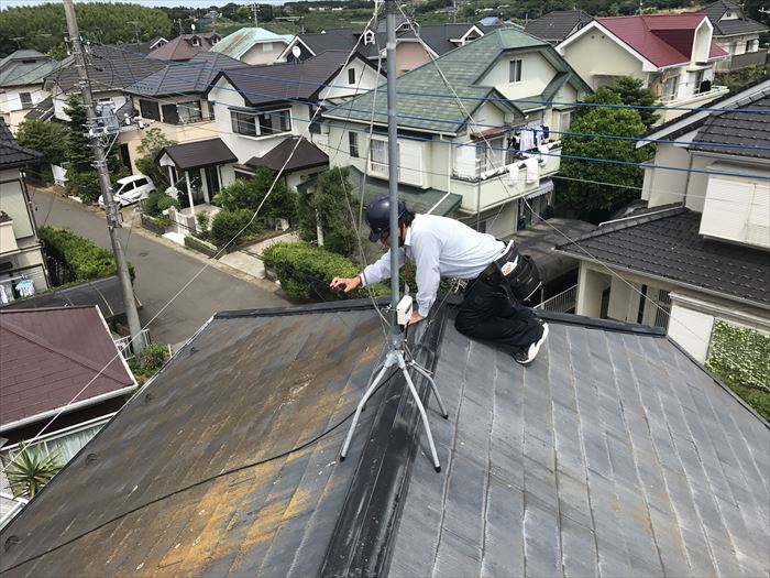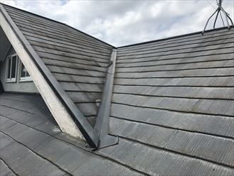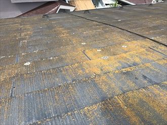 お客様の屋根の素材は化粧スレートでした。スレート(カラーベスト・コロニアル)は和瓦と違い、定期的なメンテナンスが必要です。塗料によっては10年と少しで塗り替え時期になります。スレートは工場ラインによりセメントを金型で成型し、大量生産していますので品質は保証されています。基本的にセメントなので、表面上の塗料が無くなると内部に水が浸透し、性能が著しく落ちていきます。