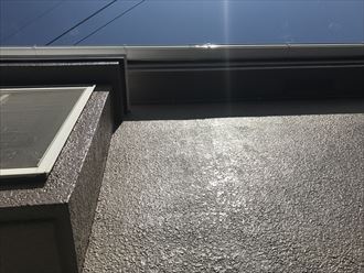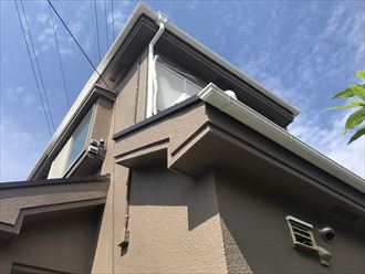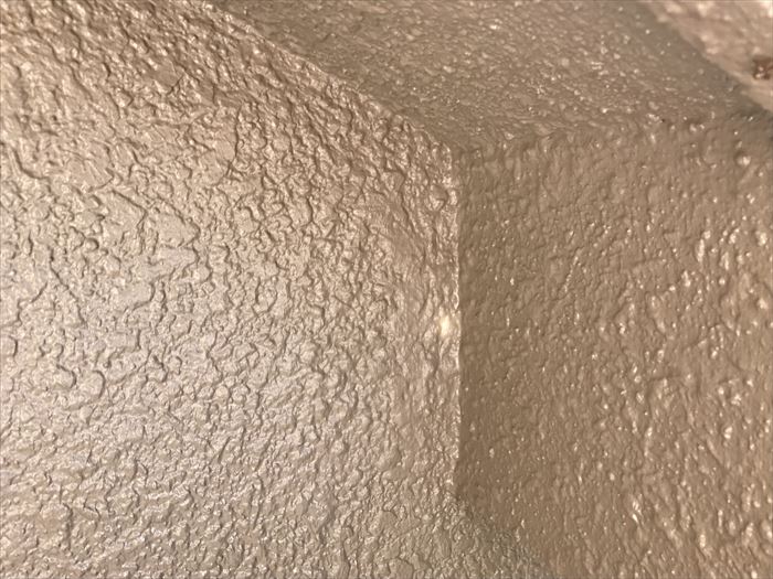 外壁塗装は日本ペイントの、パーフェクトトップを塗装しました。下地処理後塗装の一回目の塗装はパーフェクトフィラーです。既存の塗料に密着し剥がれやクラックの発生をさせないための下塗り材です。基本リフォーム工事ですので、新築時とは違い、既存の外壁は思っているよりも、ダメージを受けています。やはり下地材の塗装が今後の仕上がり面に大きく影響が出て来るなので、非常に大切であります。今回2回目の点検ですが仕上がり面に変化が見られないのは、しっかりと施工した下地材のおかげでしょう。