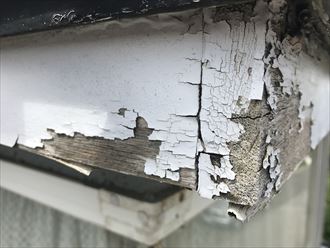 今回、外壁塗装のご依頼をいただいたのですが、外壁塗装を工事する前にいろいろな箇所を見なくてはいけません。調査して観ると破風部分に大きな穴の腐食がありました。腐食は木部の破風板に大きなダメージをあたえていました。破風板のダメージは破風板だけではなく、軒天井までも腐食が進み、破損寸前でした。軒天のベニヤも数枚剥がれていまして、このままでは塗装が出来ません。いろいろな業者いましてお安くやるためにそのまま塗りつぶしてしまう業者もいます。出来上がりは綺麗なのですが、数年で同じことの繰り返しになってしまいます。