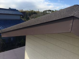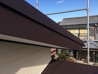 弊社の他の現場施工事例の写真です。破風板の腐食が進んでしまった場所に板金でカバーしてしまいます。築30年近い住宅の一般的な破風板は木製が多く塗料のメンテナンスで定期的に雨水の浸入を止めていなければ袖ケ浦のお客様邸の様に腐食の進行が進み修復が困難になってしまわれます。破風板は一枚の板で多様な部分とつながっています屋根下地や軒天部分と密接につながっているので、一枚直すのに色々な場所も一緒に工事が必要になります。金額が高くなるとお考えですが将来、一枚の板の不具合で色々な場所まで直す事を考えると、一度の工事で密接な資材まで保護ができる板金カバー工事は決して高い買い物とは言えないと思います。