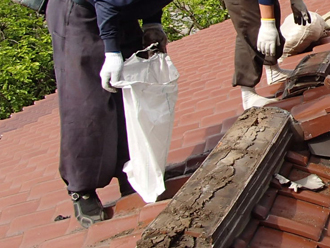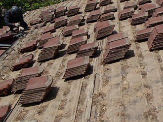 袖ヶ浦でハイブリット瓦に葺き替えるため日本瓦の撤去作業