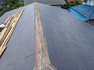 屋根に上ってみると、確かに塗装をしていることから艶もあり見た目は綺麗ですが、それは表面的なもので棟板金には隙間が多く見られ、そこから浸水していることが分かりました。