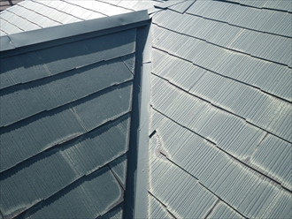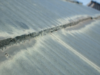 スレート葺きの屋根で、確かに塗装をした形跡があります。割れや欠けもあちこちに有りました。気になるのは、スレートの重なり部分の雨染みです。
