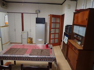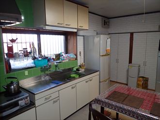 キッチンは少々古くなっていますが、綺麗に使用しているため、まだまだ使用できますね。キッチンをリフォームすると、どうしてもお値段は高くなります。この写真のように出窓などが有ると、お見積りは結構なお値段になり、正直ビックリすると思います。実はキッチンで一番掃除しにくいのは換気扇で、次にタイルの壁面です。蒸発し、こびりついた油ほど取れにくいものはありません。キッチンパネルに変えれば、ホコリや油など簡単にお掃除できるようになります。しかも、イメージチェンジもできます。