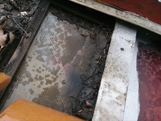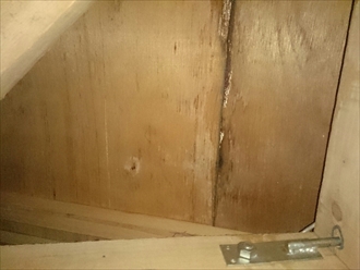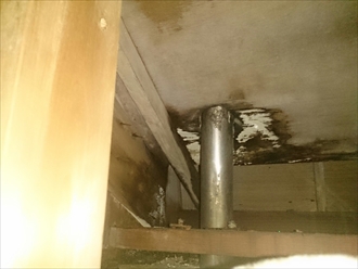 左の写真が丁度板金が逆の納まりになっている部分です。雨染みがついていて雨が垂れた跡があります。右の写真は排水口まわりで雨漏りによって濡れてカビが生えていました。板金自体はサビなどもなくしっかりと排水口に流れる造りになっていますが、板金の下に入り込んだ雨水は抜ける所が無く、排水口の周りのベニアの穴から漏っています。