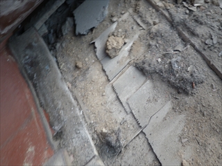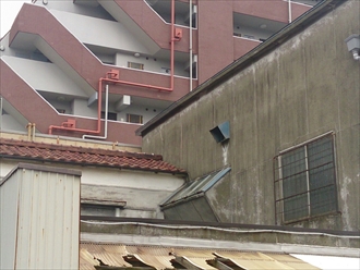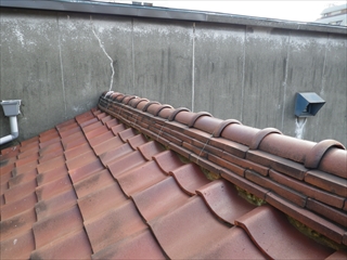 雨漏りしているのは、瓦葺き部分です。立ち上がりの壁面にも大きなクラックが有ります。今回は、この瓦屋根をスレート屋根に葺き替える工事を行います。