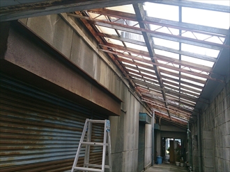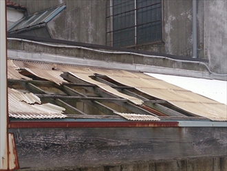 駐車スペース部分の屋根の波板も劣化して剥がれたり割れたりしており、一緒に張替え工事を行うのですが、木で組んである下地が腐っている部分が有るので、骨組みから作り直す工事です。耐久性の高いポリカーボネートで仕上げる予定です。