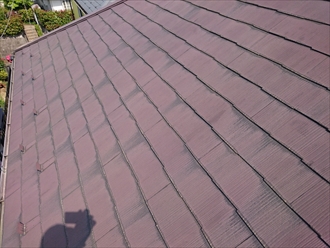 横浜市神奈川区で屋根の調査をおこないました。築20年で一度塗装工事をおこなっているのですが、そろそろ色褪せが目立ってきたので綺麗にしたいというご希望です。塗装工事をおこなう時には、塗装が出来る状態なのかどうかを確認しなければなりません。以前に塗装した時のやり方を確認する事が出来ないので、傷み具合を確認していきます。表面は劣化していて雨染みも出ていますし、チョーキングが出ていてズルズルと滑ってしまいます。表面だけ見れば塗装工事が可能かもしれませんが、築20年を経過してくるとスレートの下の防水紙の寿命も考えないとなりません。塗装をしても防水紙の劣化があると、数年で雨漏りする可能性が高くなってきます。屋根の塗装工事が雨漏りを防ぐ事にはなりませんので、今回のメンテナンスは上から金属屋根を被せるカバー工事をご提案しました。